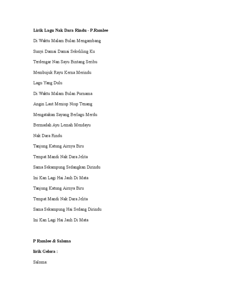 Lirik Lagu Nak Dara Rindu P from imgv2-2-f.scribdassets.com Lagu lagu p ramlee (lırık). Ramlee tidak disediakan kitablirik.blogspot.com, anda bisa membelinya melalui media digital seperti itunes, jook, langit musik, spotify, deezer dan media pembelian musik lainnya. Rupa kamu yang cantik mata kamu yang bulat membikin pemuda jadilah gembira. Blog lirik lagu ini tidak menyediakan sebarang link untuk download lagu mp3 * dari * samada dalam format mp3 atau sebarang format audio yang lain. Rupa kamu yang cantik mata kamu yang bulat membikin pemuda jadilah gembira. Pilih satu link dari 15 daftar dibawah untuk streaming video klip mp4 di metro musik, detail informasi dan kumpulan full album lagu terkait. Download lagu, lirik lagu, dan video klip terbaru. Maafkan kami lirik p ramlee shamsuddin aziz.